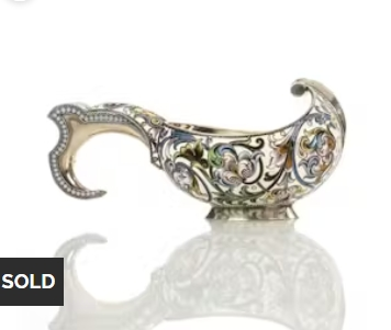 A Russian 88 standard silver and enamel kovsh\nby Fedor Rückert, Moscow, circa 1890, retailed by Pavel Ovchinnikov\nOf traditional form, the rounded bowl and hook handle decorated with elaborate scrolls and flower heads in varicolored shaded cloisonné enamel against cream background, blue pellet border delineate outline of handle, raised upon spreading plain circular foot, gross weight approximately 3oz troy.\nlength including the handle: 5 3/4in (14.5cm)