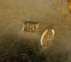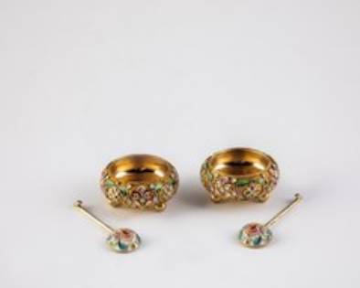 Paar Rückert Cloisonné-Email-Salieren mit Löffel Russland, Moskau, Feodor Rückert, 1896-1908 Silber, vergoldet. Die Wandung umseitig mit Blatt- und Blütenwerk aus polychromen Email auf punziertem Fond. Laffe mit Blüte aus buntem Email auf cremefarbenen Grund. Unterseite & Stiel mit Bezirksbeschauadministrationsmarke mit Feingehalt ''88'' und Meistermarke ''FR'' in Kyrillisch. D. 3,3 cm, L. 4,7 cm (Löffel), 41 g A pair Rückert silver-gilt and cloisonné enamel salts with spoons. Russia, Moscow, Feodor Rückert, 1896-1908. Salts decorated with blossoms and leaves in polychrome cloisonne enamel on stippled ground. Reverse of the bowl with polychrome blossom on white ground. Bottom and handle stamped with assayer's ark with 88-standard and master's mark ''FR'' in Cyrillic. Diam. 3.3 cm (salts), 4.7 cm long (spoons), 41 gr.