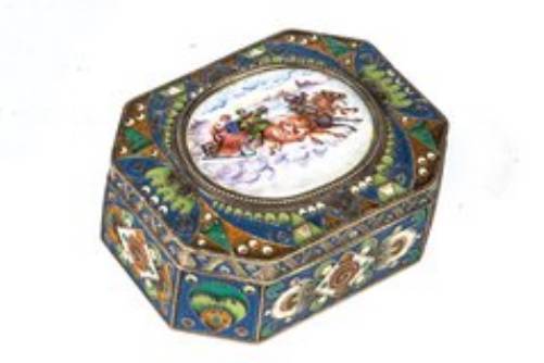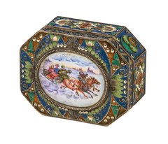 Silber, innen vergoldet. Rechteckige Form mit eingezogenen Ecken. Umseitig geometrischer Cloisonné-Email Dekor in Grün, Blau, Rot und Weiß. Auf dem Scharnierdeckel Ovalmedaillon mit bunter Emailmalerei: Troika in Winterlandschaft. Unterseite und Deckel punziert mit pseudo-russischen Marken (Moskauer Bezirksbeschauadministrationsmarke mit Feingehalt ''84'' und Meistermarke ''FR'' (Fedor Rückert). L. 9 cm, ca. 225 g