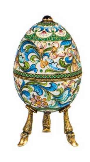 Cloisonné-Email-Ei Auf drei hufenförmigen Füßen. Die zweiteilige Wandung mit feinem Blattrankendekor auf cremefarbenen Grund. Gerahmt von Perlbändern. Spitze und Unterseite mit rotem Cabochon besetzt. Gestempelt mit pseudo-russischen Marken, darunter Beschauadministrationsmarke mit Feingehalt ''88'', Firmenzeichen ''Faberge'', Meistermarke ''FR'' (Fedor Rückert) und Importmarke. H. 10 cm
