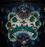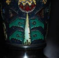 Outstanding Faberge Silver Enameled beaker -mark for Faberge in cyrillic (K.Faberge), mark for Feodor Ruckert (FR) , 84 and faded number 8 (inventory number). The enamel on the beaker is in perfect condition, no crazing,no cracks.Perfect detailing.Measures: 4 1/2" tall x 2 3/4" diam. Feodor Ruckert was famous for producing the most expensive and beautiful enamel items in Russian Style.Although he owned a small shop in Moscow,he was mainly making enameled items for Faberge.Those creations were marked with both marks-for Faberge and Feodor Ruckert. Please enlarge the pictures for a close up look. Dealers always get a discount. Communication is very important,so please if you have more questions,or wish to make an offer, do not hesitate to contact me.