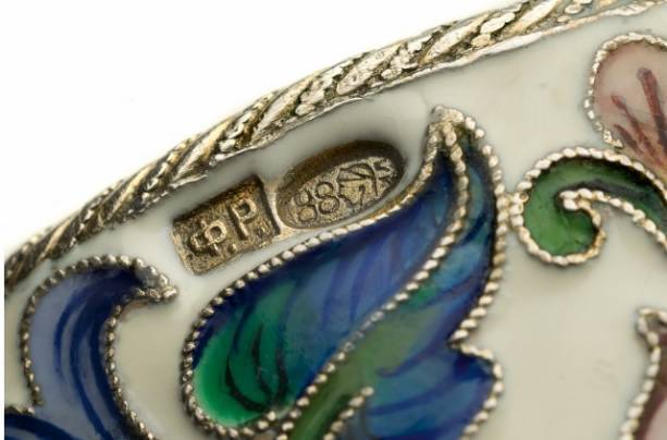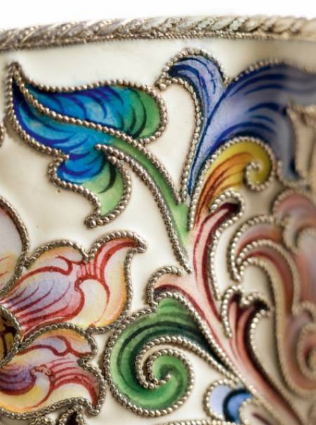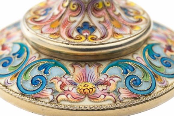 Silber 88 Solotnik, partiell vergoldet und emailliert. Auf getrepptem Rundfub, kurzer Balusterschaft, kelchfцrmige, am Ansatz gerippte Kuppa. Auf der Wandung umlaufend feiner Rocaille- und Blumendekor in Cloisonne-Technik. Feingehaltsstempel und Meistermarke «FR» in kyrillischen Buchstaben. H. 18,5 cm. 256 gr.