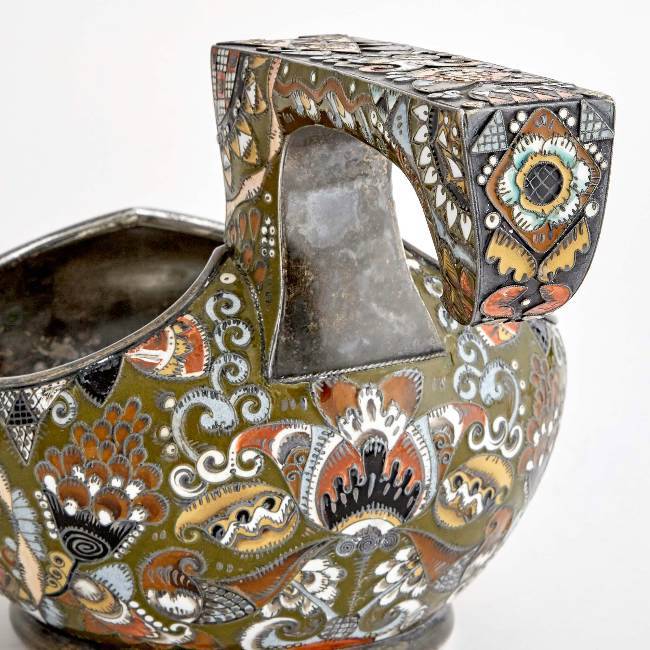 It was during this latter period that Rückert was at his most inventive and produced his finest works. Turning from realistic floral decoration in a jewel-tone palette, he embraced the use of abstracted floral and vegetal forms, geometric motifs and animal forms, using a palette that mixed earth tones with jewel tones. The forms of his objects, for example the handles of kovshi, became more exaggerated and experimental. Lot 11 in Doyle’s April 28 Russian Works of Art auction, a Silver-Gilt and Cloisonné Enamel Kovsh by Rückert and retailed by Fabergé, with its abstract floral ornament in earth tones and angular handle, is one such example. Lot 13, a Silver and Cloisonné Enamel Bowl by Rückert, was cast with handles in the form of bear’s heads that lend the object a folkloric quality.