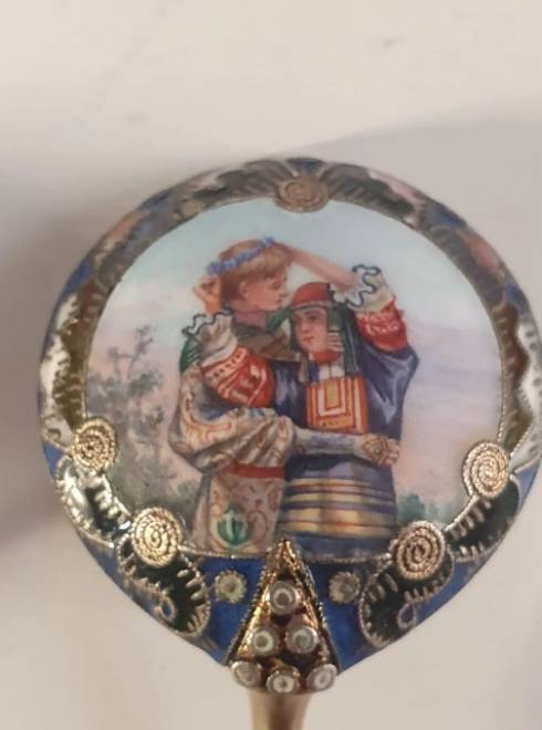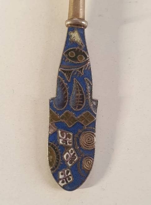 Exceptional pair of Imperial Russian enamelled silver spoons, silversmith Feodor Ruckert, Moscow,