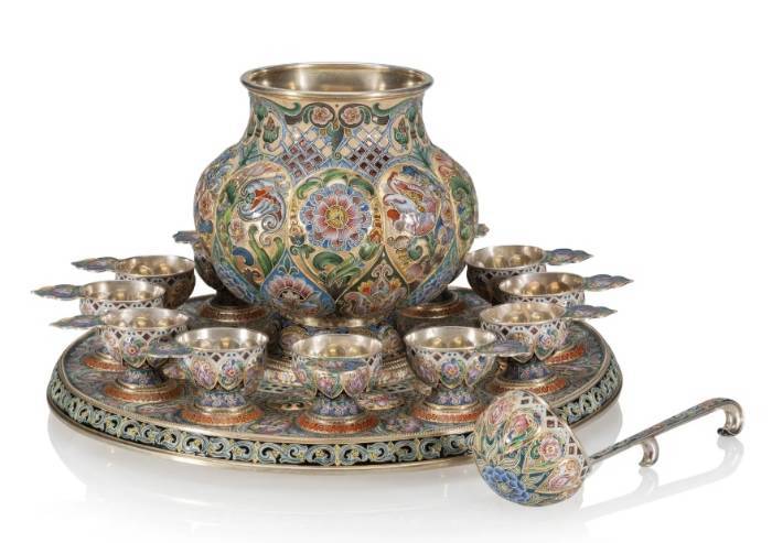 The offered lot is one of the most impressive punch sets in the Pan-Slavic style produced by the workrooms of master enameller Feodor Rückert for the House of Fabergé. Very few complete works of this scale survived the Revolution, and the exceptional and recently rediscovered journey of this work from the storerooms of the Fabergé firm to the home of a General Motors executive in New Jersey is a lesson in history, revolution, and social and economic change. Fabergé and Rückert