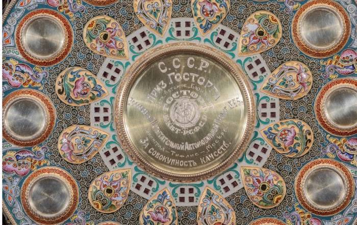 The box was applied with an engraved plaque reading ""U.S.S.R / Gostorg Prize / Gostorg / Moscow / N.K.V.T – R.S.F.S.R. / All-Union Automobile Speed Trials 1925 / For Overall Quality". This plaque covered the spot where the Imperial or princely arms had once been centered. It is ironic that the prize chosen for a great Soviet achievement in modern technology was a stolen masterpiece of the previous regime, chosen for its unique beauty and "Russianness".