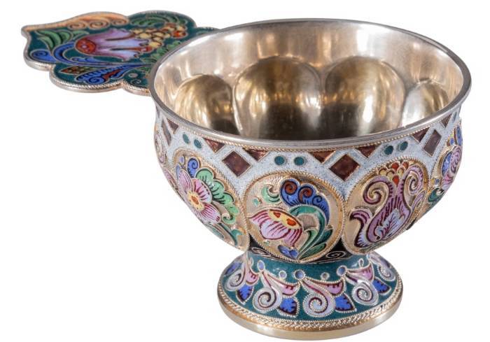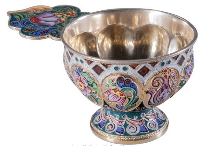 The Confiscation and Nationalization of the Fabergé Firm's Stock, 1919 On March 30, 1919, a Soviet commission from the Cheka arrived at the store's shuttered premises to carry out the nationalization of Fabergé's property. The removal of the valuables, which began with the impoundment of Fabergé's stock in September 1918, was technically illegal, as the company and its assets were formally owned by foreign stakeholders. However, internal violations within the Fabergé firm also played a role—two employees were caught attempting to sell 8 kg of gold in a sting operation orchestrated by the Cheka, and this was used as an excuse to take the valuables. At the time of this confiscation, an important inventory was drawn up, which listed all of the property remains in the firm's vaults, workrooms and storage areas, together with valuations. The offered lot is described as "Box No. 64" and clearly identified from its conforming inventory numbers: "23318 1 enamel Bratina; 23319 12 enamel charkas; 23320 1 enamel tray, 23321 1 enamel ladle" and with the ensuing weight of 17 funt' 16 lot (approximately 17 lbs 2.5 oz) and valued at 10,400 rubles.
