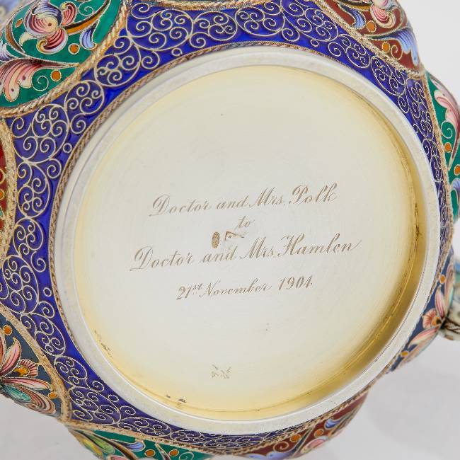 Of baluster form, the lower section with lobed cartouches enameled with shaded varicolored stylized floral sprays on pink, pale blue, dark blue, pale green, dark green, and red grounds, within twisted ropework borders, the upper section enameled with shaded varicolored flowers and stylized foliage on a cream ground, all below a twisted ropework rim, the shaped handles with conforming decoration, the underside with an engraved dedication inscription: Doctor and Mrs. Polk / to / Doctor and Mrs. Hamlen / 21st November 1904. Height 5 1/4 inches (13.3 cm).