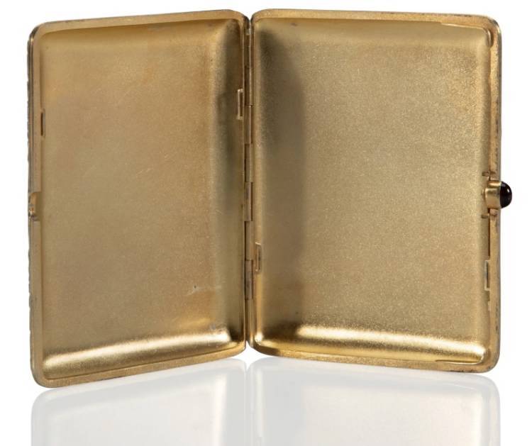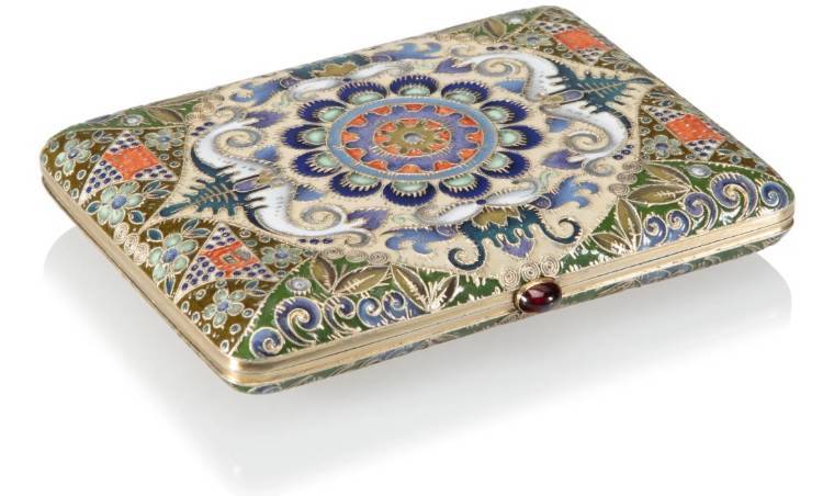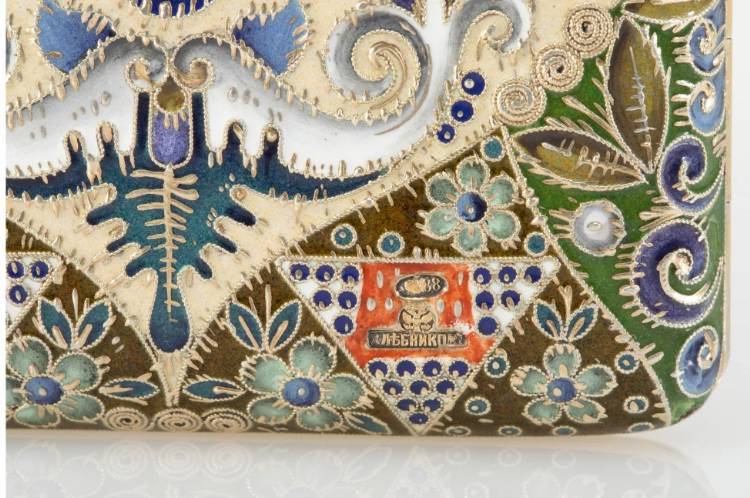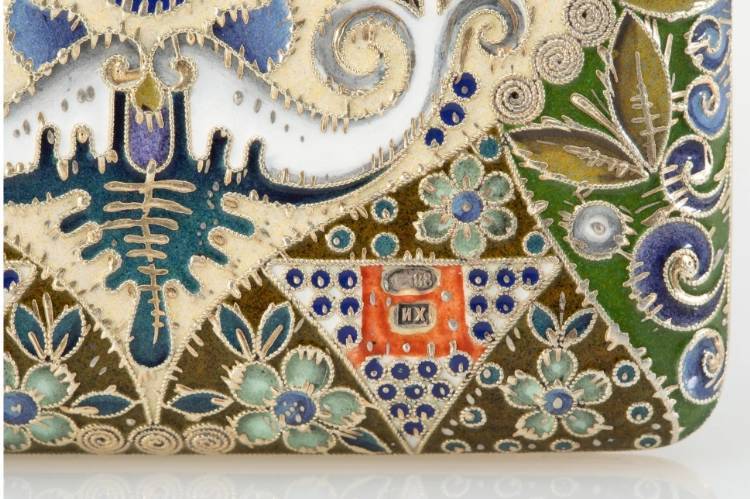 This beautiful case in the pan-Slavic style is undoubtably by the hand of Feodor Rückert, the marks likely overstruck with those of the famed Moscow firm of Khlebnikov, who commissioned and retailed from and by Rückert for many years. For other works by Rückert retailed by Khlebnikov, see also a covered cup sold in these rooms December 16, 2024, lot 82071.