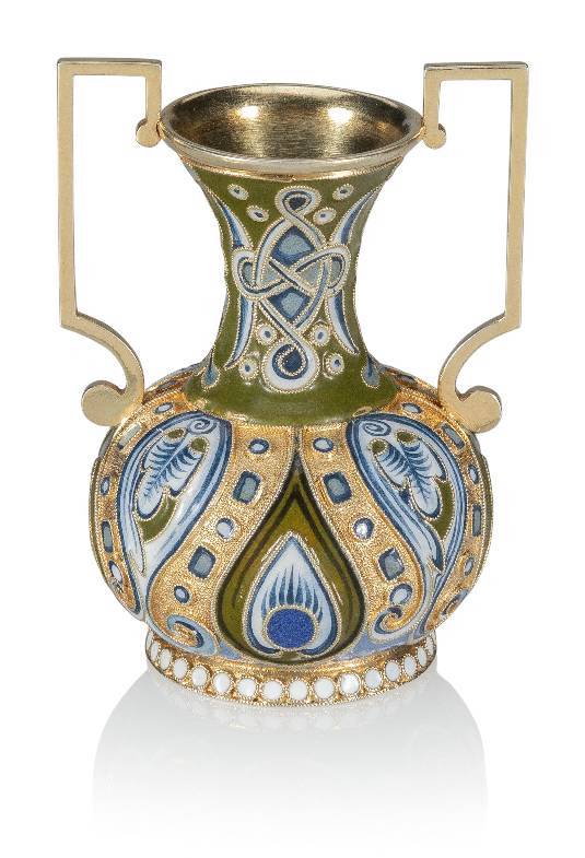 A Russian Pan-Slavic-Style Cloisonné Enameled Gilt Silver Miniature Vase