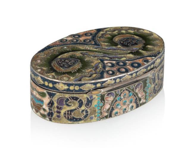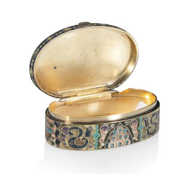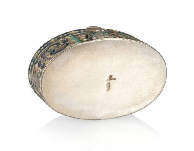 A Fabergé Gilt Silver Cloisonné Enameled Oval Box in the Pan-Slavic Taste