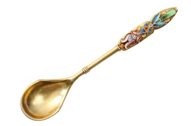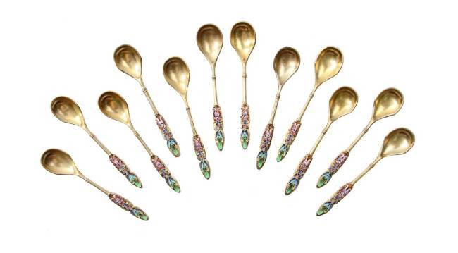 A set of 12 Feodor Ruckert gilt-enamel spoons with cloisonne enamel in Pavel Ovchinnikov original case.