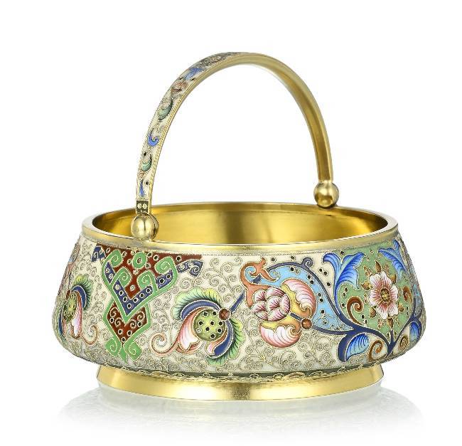Panier à sucre et passoire en vermeil et émail cloisonné, orfèvres Féodor Ruckert et Maria Semenova,