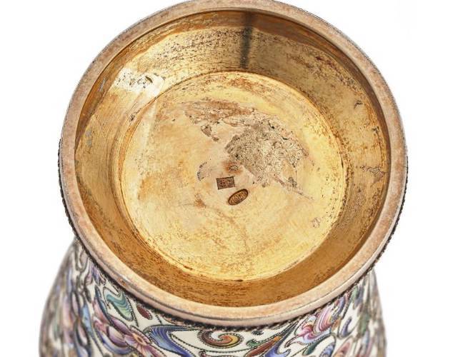 FEODOR RÜCKERT, A SILVER GILT AND CLOISONNÉ ENAMEL BEAKER WORKMASTER FEODOR RÜCKERT, MOSCOW, 1899-1903 Enamelled with colourful floral and foliate motifs on a cream ground, 88 standard, struck with initials FR in Cyrillic, assaymaster Ivan Lebedkin, later French import mark Size/dimensions: 10.4cm high Gross weight: 209.6 gramsProvenance: Private Collection Sale, Sotheby's New York, 'Russian Art' 16 April 2007, Lot 17 Condition Report: Some scratches and staining to inside. Some tarnish to recessed areas. Minor pitting to enamel and light wear. Good clear marks. Condition Report Disclaimer
