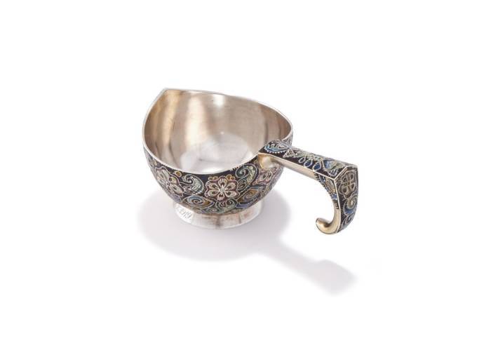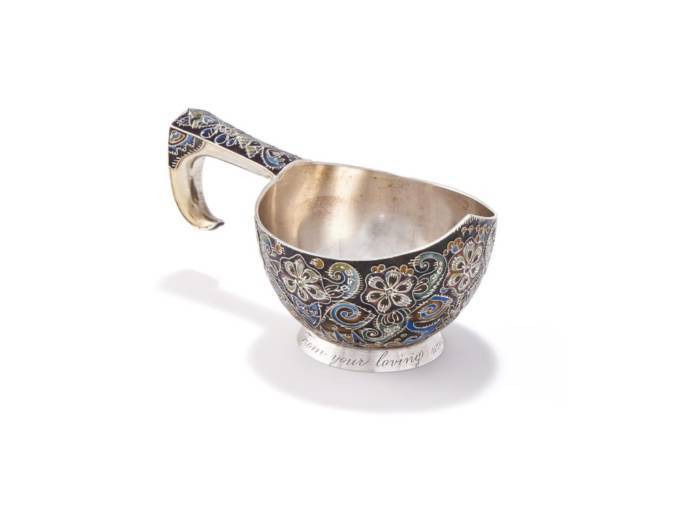 Emailled with blues, greens, mauve and grey on a brown ground, with an angled handle. the foot engraved 'From your loving wife 27.X.1919', Imperial Warrant mark oversriving with Feodor Ruckert's mark, 88 standard11cm de long109g.3.53 oz)Provenance:Une collection privée d'émaux cloisonnés russes.Le pied est gravé 'From loving wife 27.X.1919', Fabergé Imperial Warrant mark overstriking Feodor Ruckert's mark, 88 standard11cm long109g (3.53 oz)Provenance:A Private Collection of Russian Cloisonné EnamelsSale, Christie's Geneva, Important Objects by Carl Fabergé Russian Works of Art, 11th May 1982, Lot 228