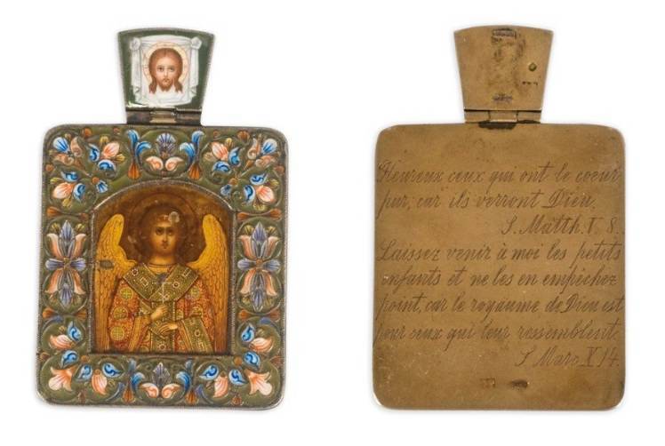 Icône de voyage représentant « L'Archange Gabriel » de Féodor Rückert, en vermeil et émaux polychromes cloisonnés, à décor de motifs floraux sur fond émaillé vert foncé, surmonté de la tête de Christ en émail. Gravé au dos « Heureux ceux qui ont le coeur pur, car ils verront Dieu, Saint-Mathieu», « Laissez venir à moi les petits enfants et ne les empêchez point, car le royaume de Dieu est pour ceux qui leur ressemblent, Saint-Marc ». Accident, manque l'attache, en l'état. Poinçon titre : 84, Moscou, 1899-1908. Poinçon d'orfèvre : Féodor Rückert, orfèvre indépendant qui travaille en grande partie pour Fabergé. H.: 7, 2 cm - L.: 4, 8 cm. Poids: 66 grs.