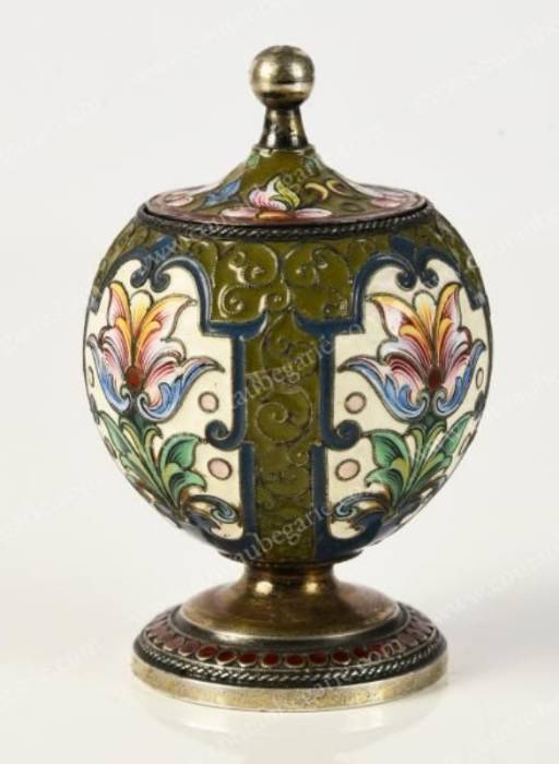 De forme bombée reposant sur une base circulaire, à décor de fleurs en émaux polychromes cloisonnés, sur fond émaillé ivoire, alterné de frises stylisées sur fond vert foncé, de style Art Nouveau. Bon état général. Poinçon titre: 84, Moscou, 1899-1908. Poinçon d'orfèvre: Féodor Ruckert. H.: 7, 5 cm - Diam.: 5, 5 cm. Poids brut: 81 grs.