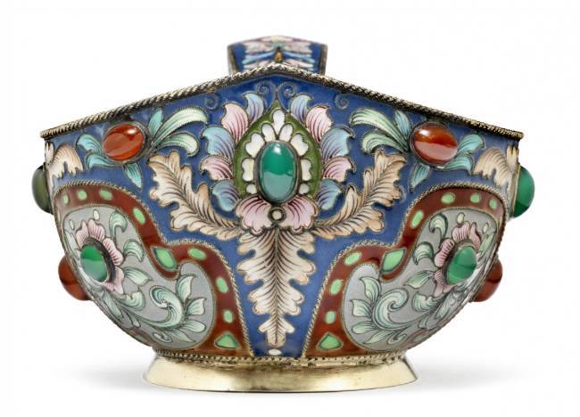 Russian silver Kovch, richly decorated with an artistic pattern made using cloisonne enamel technique. The unique Salmon enamel applied in the form of stylized pink flowers and also gently green foliage on gray background in red cartouches are especially notable. Red and green cabochons are encrusted in the drawing around the bucket. Gilding.