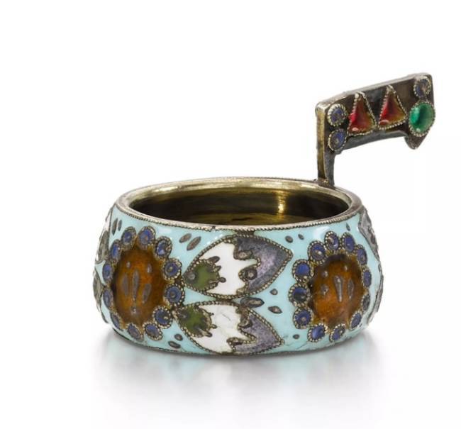 Miniature silver Fabergé kovsh with cloisonné and stained glass enamel. Fyodor Rückert, Moscow, 1908–1917