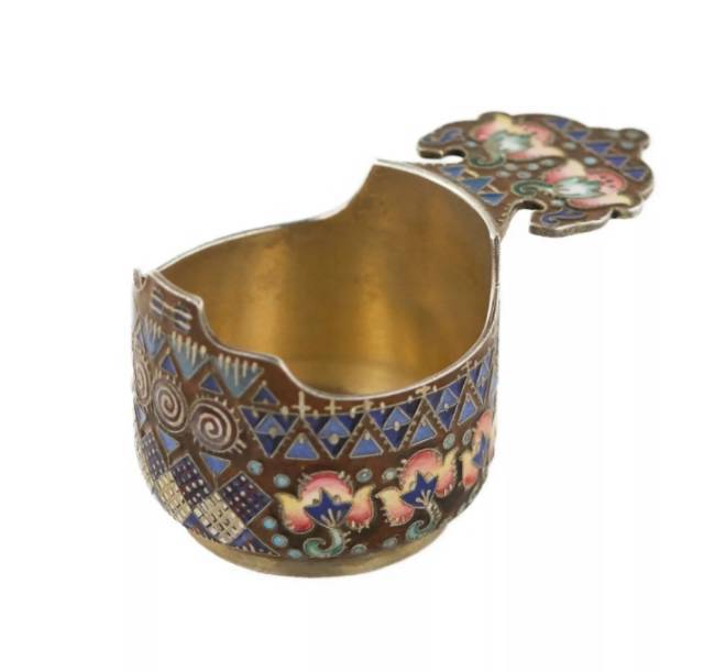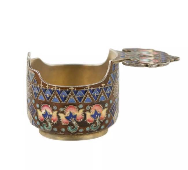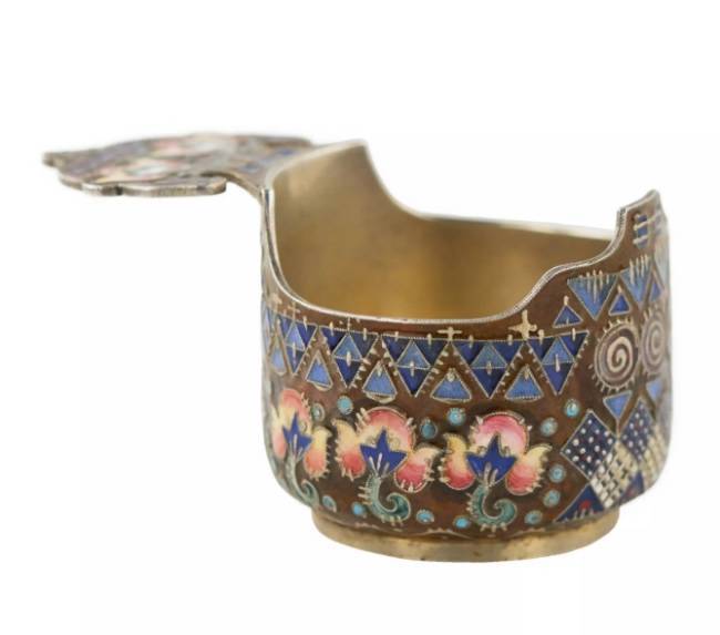 Russian Art Nouveau kovsh in cloisonné enamel by Fyodor Rückert. Moscow, 1908-1917