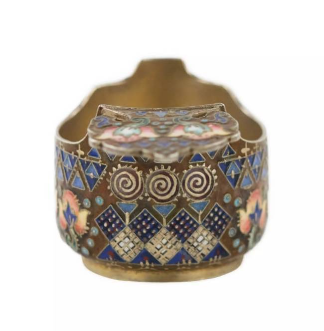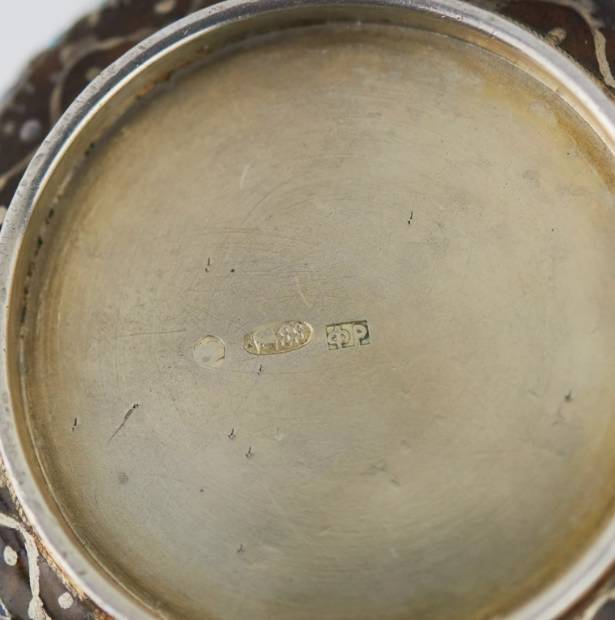 It is a cylindrical bowl with a contoured edge and a transverse heart-shaped handle. The body and top side of the handle are decorated with painted, fairy-tale flowers and geometric motifs of blue triangles on the deep, signature brown background of Feodor Rückert. The stem and sternpost are marked with a geometric motif of spirals, rhombuses and triangles, stylizing jets of water, flowers or solar signs. High pictorial generalization is introduced by applied drops of icicles, crosses and lattices made of pure silver. They give the work endless depth and nostalgia of the Russian north. On the base of the ladle there are Moscow hallmarks of 88 standard silver of 1908-1917 and the initials of the leading Fabergé enameller Fyodor Rückert, FR in a square shield. Height 4.5 cm. Diameter: 5 cm. Weight: 83 g.