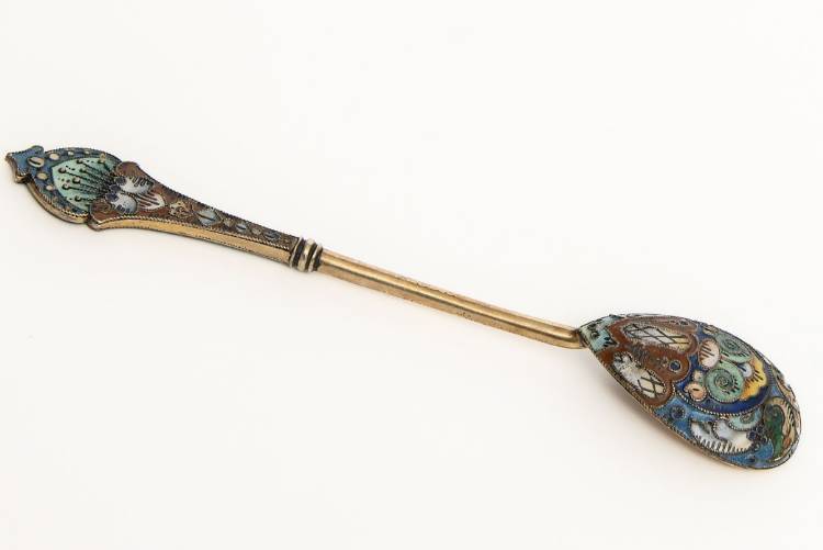 SUPERBE CUILLÈRE À CAFÉ en vermeil 875 millièmes (84 zolotniki), le manche sphérique, l'extrémité plate et le dos du cuilleron richement décorés d'émail polychrome cloisonné de motifs principalement végétaux d'inspiration Art Nouveau, dans le goût des production de Féodor Ruckert. Orfèvre non répertorié (VIK en caractères cyrilliques), Moscou, 1908-1917. Petits sauts d'émail, bon état. L. 14.5 cm. Poids brut: 30 g.