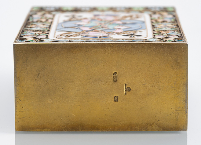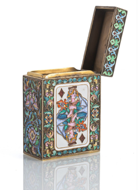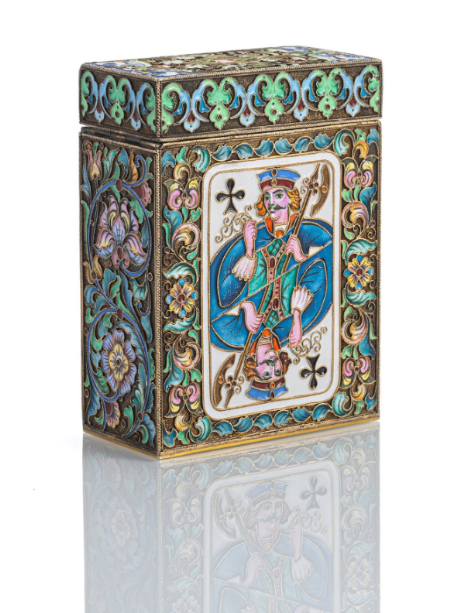 Argent, partiellement doré, décor en émail cloisonné polychrome avec motifs de cartes à jouer, fleurs et aigle bicéphale. Marque Kokoshnik avec delta et 88 (Zolotnik), marque de maître "FR" (cyrillique) pour Fedor Rückert (atelier), ainsi que marque de fournisseur de la cour de Fabergé. Environ 410 g. Min. usé.