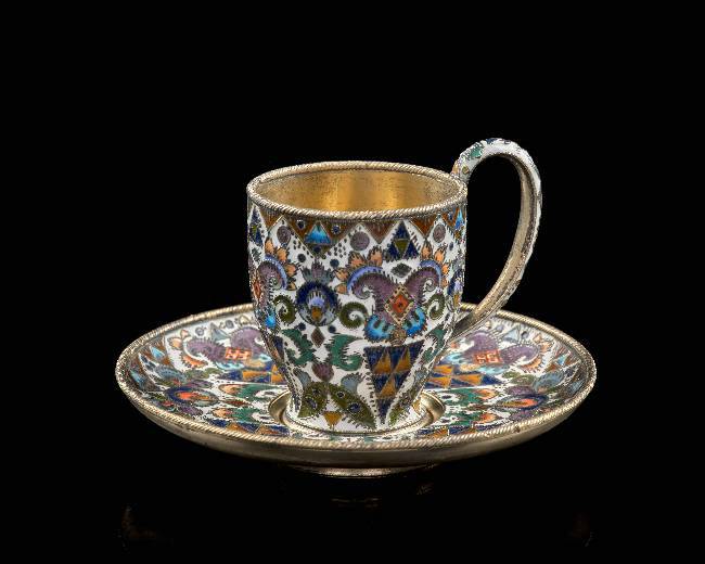 A silver-gilt and polychrome cloisonne enamel cup and its saucer, by Fabergé, Ruckert, Moscow, 1908-1917
