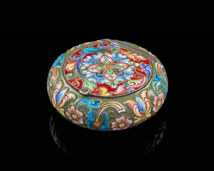 A silver-gilt and polychromed cloisonne enamel pill box, by Théodore Ruckert, Moscow, 1908-1917