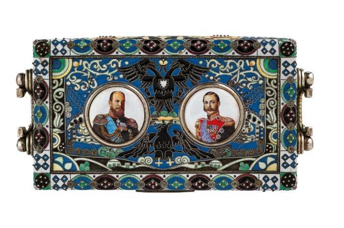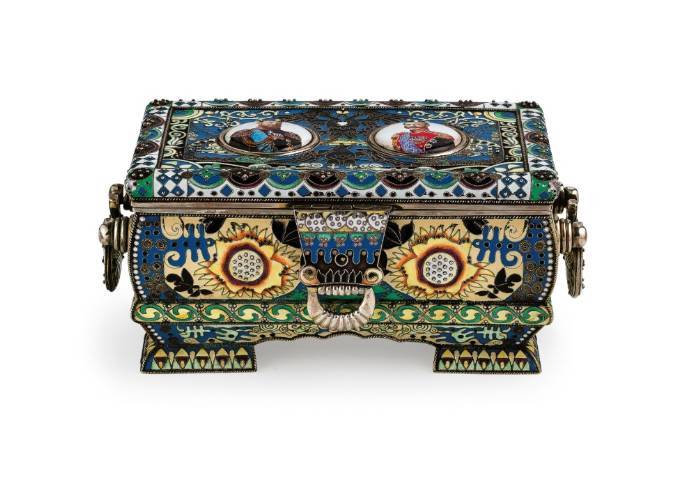 a quattro piedini, manici a ferro di cavallo, superficie decorata in smalti a motivi geometrico-naturalistici, coperchio con le effigi di Alesssandro II e Alessandro III, sul fondo bolli di imitazione russi di Mosca, 1908-1917, orafo F. Ruckert; difetti