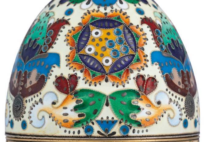 decorato a motivi naturalistici e geometrici, reca bolli spuri di Mosca, 1896-1908, orafo F. RUCKERT; difetti
