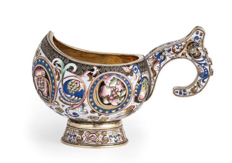 A RUSSIAN PRESENTATION SILVER-GILT AND CLOISONNÉ ENAMEL KOVSH, MOSCOW, 1908-1917,