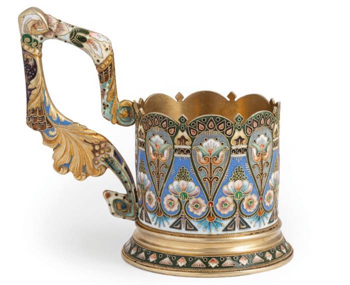 A RUSSIAN SILVER-GILT AND CLOISONNÉ ENAMEL TEA CUP HOLDER, MOSCOW, 1908-1917