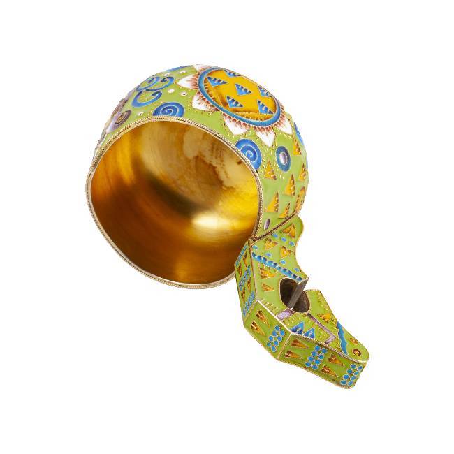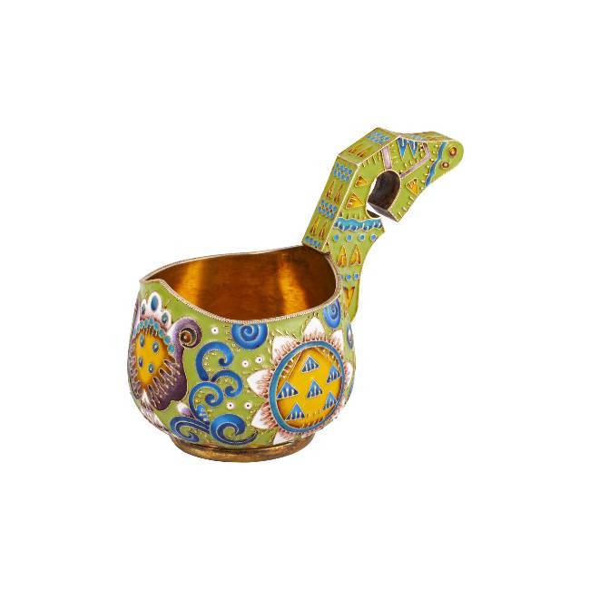 A very fine Faberge silver-gilt and cloisonne enamel kovsh. Makers mark of Fedor Ruckert for Faberge firm. Moscow, 1908-1917. Dimensions: 8 x 11 x 7 cm.