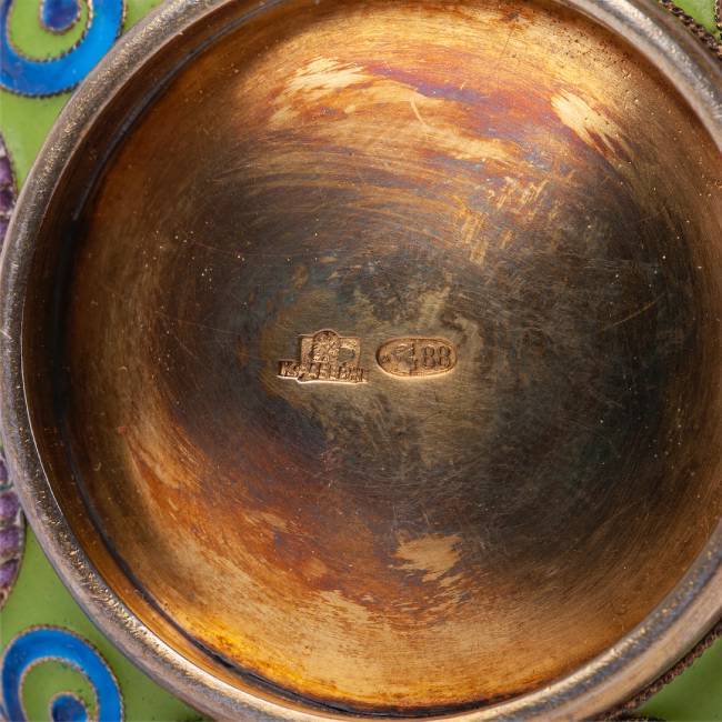 A Faberge silver-gilt, cloisonne enamel kovsh