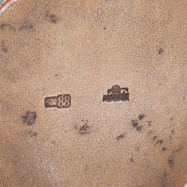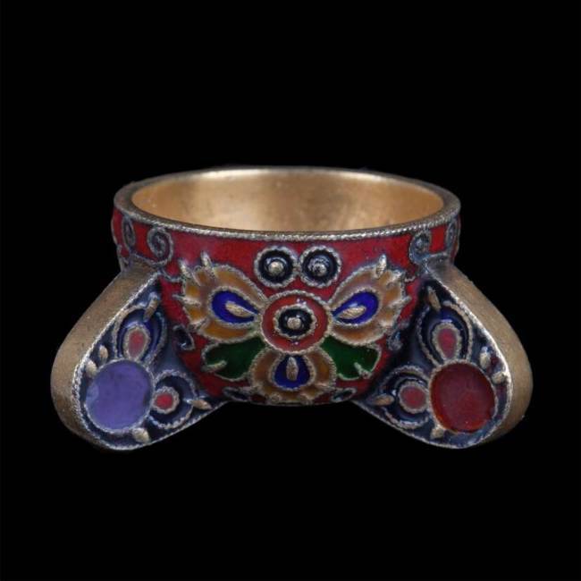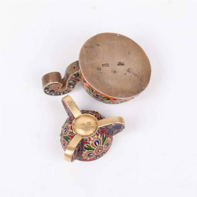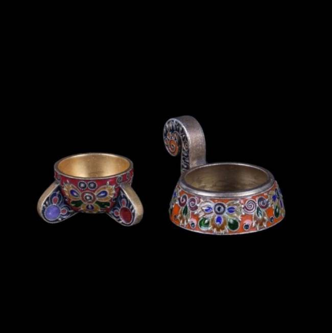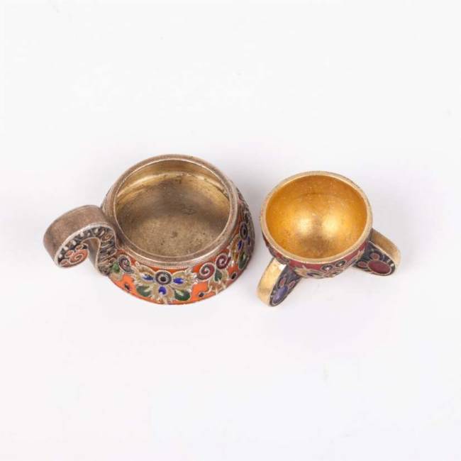 Серебро 88-й пробы, скань, перегородчатая эмаль. Москва, после 1908 года, мастер Фёдор Рюкерт, фирма К.Фаберже. Высота ковша: 23 мм.