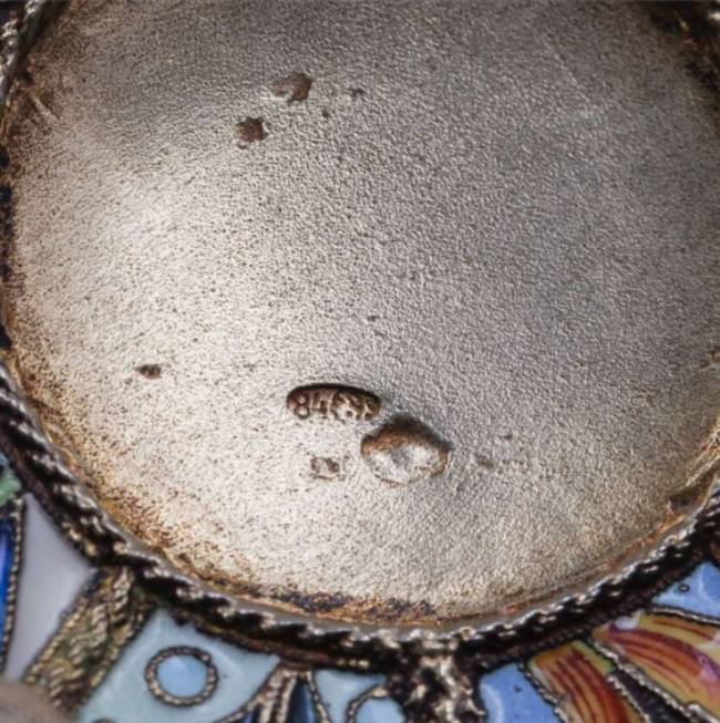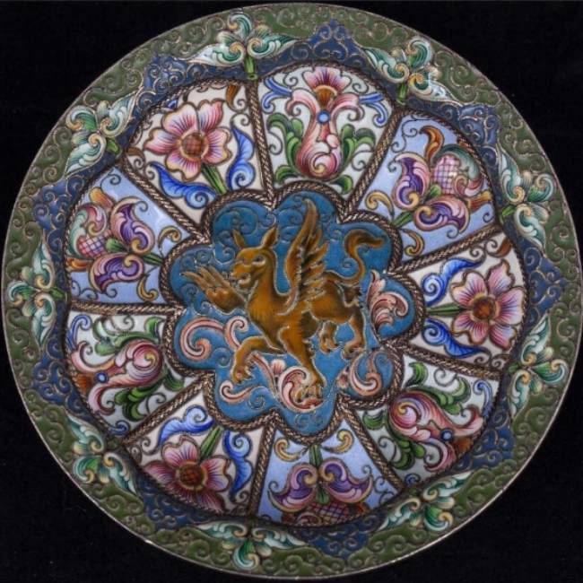Декоративная ваза на ножках шарах в неорусском стиле. Серебро, расписная эмаль, позолота. Мастерская Ф. Рюккерта (?). Москва, 1898-1908.
