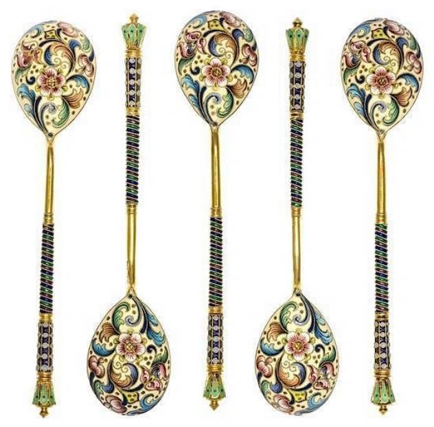 A Group of Five Russian Silver-Gilt and Enamel Teaspoons, Mark of Fedor Ruckert, Moscow, early 20th century, each having a gre