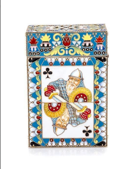 the box decorated with polychrome foliate and geometric decoration throughout, the sides with enamel plaques depicting the King of Clubs.