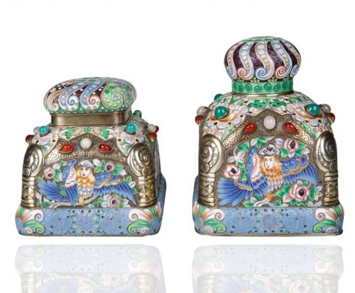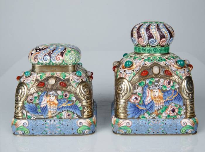 a pair of 20th century tea caddies, the body is decorated with Slavic foliate and floral motif and garments on guilded ground, with images of sirens on two sides, both pieces have spurious mastermarks F.R. for Feodor Ruckert in Cyrillic, with 84 standart mark on the bottom; height: 16 and 13 cm (6 1/4 and 5 1/8 in.)