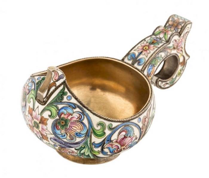 the surface enamelled in polychrome shaded scrolling flowers on a cream ground, with ring foot and hook handle, 88 standard, workmaster`s mark F.R. for Feodor Ruckert, Moscow, 1898-1908, height: 4.5 cm. (1 3/4 in.)