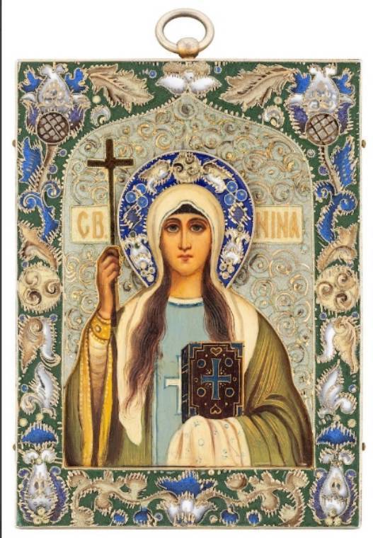 A FABERGE SILVER AND SHADED CLOISONNE ENAMEL ICON OF SAINT NINO, WORKMASTER FEODOR RUCKERT, MOSCOW, 1908-1917