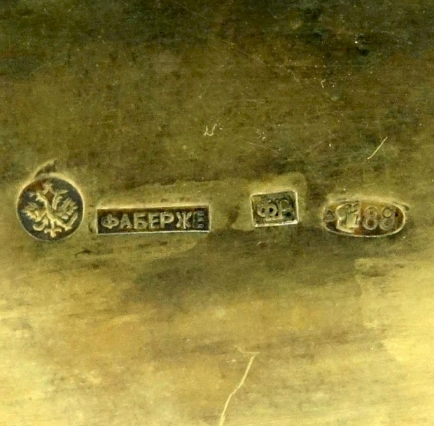20th Century Russian Cloisonne Enamel Hinged Box. Signed Faberge, Double eagle Imperial Warrant Mark, FR and 88 Kokoshnik. Good condition. Measures 1-7/8" H, 2-3/4" L. Approx. weight: 5.5 Troy ounces.
