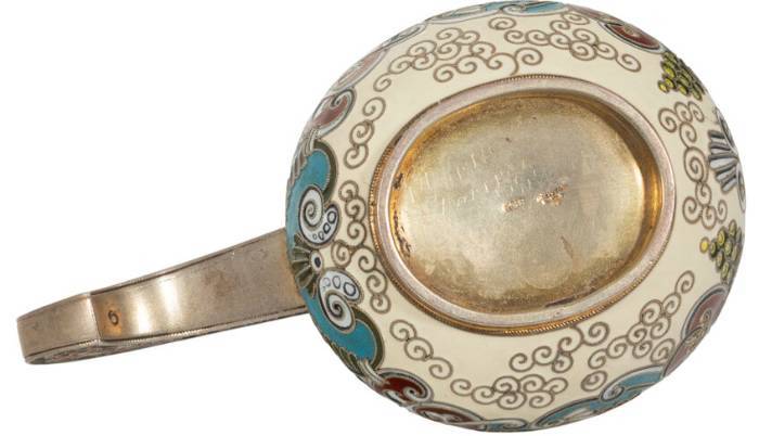 This small kovsh bears the inventory number 23077 which makes it part of a series of seven small kovshi by Rückert for Fabergé.