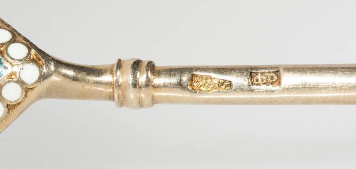 A Russian Gilt Silver Cloisonné, Plique à Jour, and Guilloché Enameled Demitasse Cup, Saucer, and Spoon