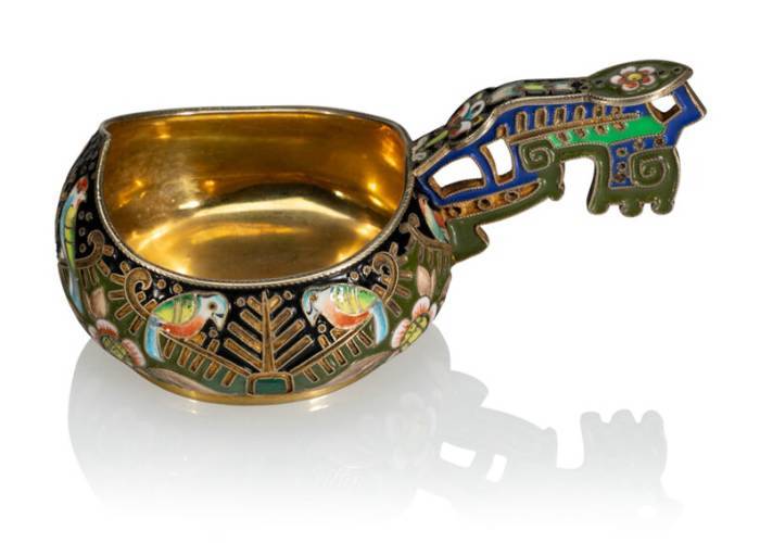 A Russian Pan-Slavic Cloisonné Enameled Gilt Silver Kovsh