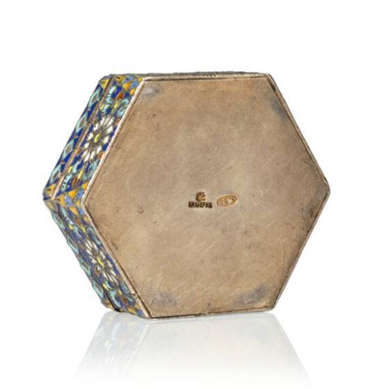 A Russian En Plein and Cloisonné Enameled Gilt Silver Pill Box: Falconer