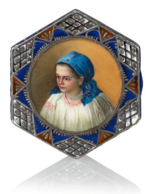 A Russian Shaded En Plein Enameled Gilt Silver Box: Maiden