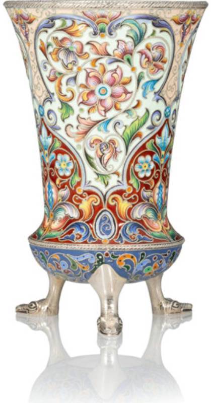 A Russian Cloisonné Enameled Three-Footed Gilt Silver Beaker