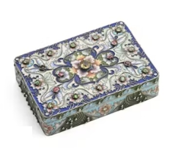 Feodor Rückert (, Moscow\n1896-1908)\n\nAn exceptional Russian gem-set, silver-gilt and shaded cloisonné\nenamel box, rounded rectangular form with hinged lid set with a\nlarge faceted citrine and eighteen smaller faceted tourmalines and\nberyls in flower-shaped mounts, the exterior with shaped panels,\nbrightly coloured blossoms and foliage against cream and green\ngrounds, the design further heightened with applied beads.\nWorkmaster Feodor Rückert, assayer Ivan Sergeievich Lebedkin in\nMoscow